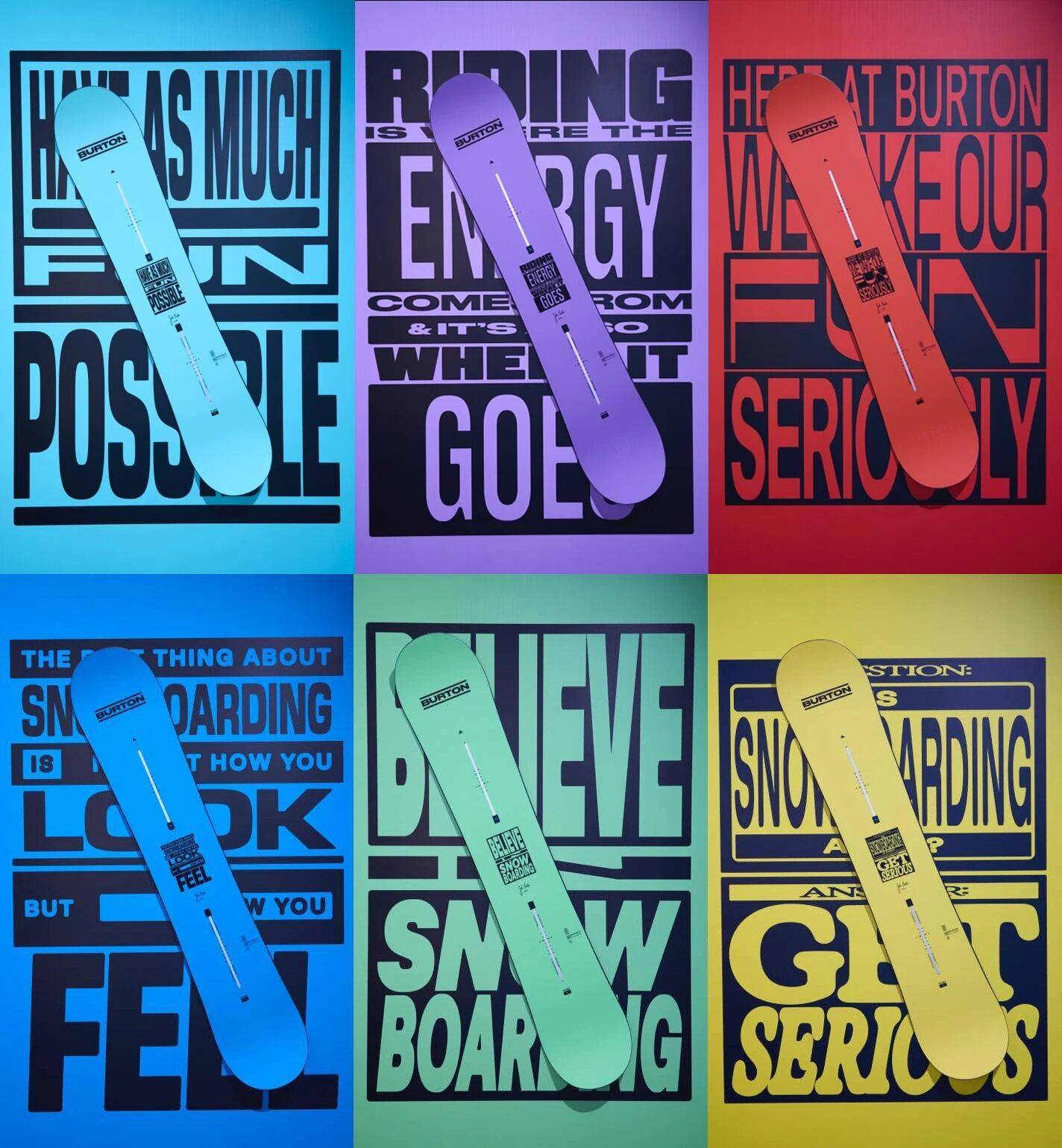眼下,BURTON就用一款全新产品,尝试给出自己的回答。2026年2月3日,BURTON正式推出From Burton To The World纪念款限定雪板系列,以品牌创始人Jake Burton Carpenter的初心与理念为设计灵感,将六句代表性经典语录以加粗字体和高饱和度的明亮色彩呈现在雪板之上。